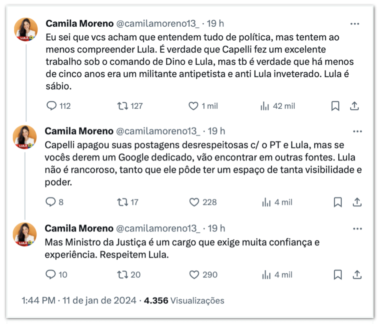 Um dia após o anúncio do nome de Ricardo Lewandowski para comandar o Ministério da Justiça e Segurança Pública, a dirigente da executiva nacional do PT, Camila Moreno, ligada à presidência do partido, divulgou em suas redes sociais um dos motivos de Lula não ter escolhido Ricardo Cappelli para o cargo de ministro de seu governo. Segundo ela, o ‘02’ do MJ fez um excelente trabalho, entretanto, Camila destacou que “há menos de 5 anos era um militante antipetista e anti-Lula inveterado”. A dirigente lembrou que Cappelli apagou postagens em suas redes sociais em que criticava Lula logo que assumiu o cargo de secretário-executivo.