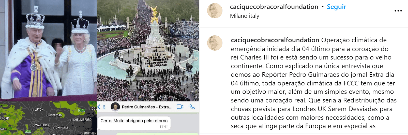 Preocupado com as previsões de chuvas durante a cerimônia de sua coroação, o rei Charles III mandou buscar no Brasil a médium Adelaide Scritori, da Fundação Cacique Cobra Coral. Adelaide diz que incorpora o espírito do cacique Cobra Coral e que ele trabalha para manipular o clima. No perfil da fundação foi divulgado que a operação dedicada a afastar a chuva durante as solenidades foi um sucesso. Essa não é a primeira vez que a médium presta serviço para a monarquia britânica. Ela fez o mesmo ritual nos casamentos dos príncipe William e Harry e no jubileu da rainha Elizabeth II.