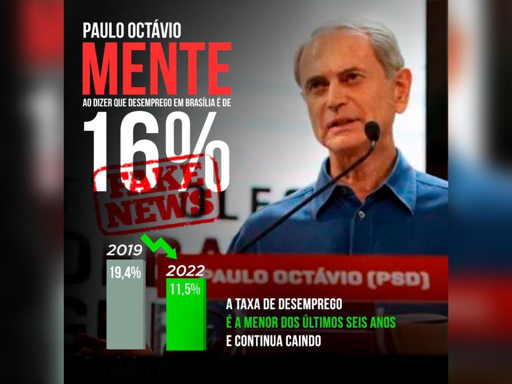 Outra fake propagada por PO foi sobre o desemprego no DF. Paulo Octávio disse que a taxa está em 16%, sendo que no último levantamento divulgado pelo IBGE, no dia 12 de agosto, o DF registrou índice de desemprego de 11,5% no segundo trimestre deste ano.
