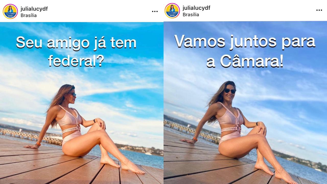 A deputada distrital Júlia Lucy, do União Brasil, está concorrendo a uma das oito vagas da Câmara dos Deputados. A parlamentar que não anda aparecendo nas sondagens junto ao eleitor resolveu apelar para seus atributos físicos. Ela divulgou uma sequência de fotos no perfil do Instagram, o famoso carrossel, onde a candidata aparece num píer trajando biquíni com a seguinte pergunta: seu amigo já tem federal?. Na foto a seguir, a deputada postou: vamos juntos para a Câmara!. A candidata já excluiu o material do seu perfil. Mas veja abaixo as imagens:
