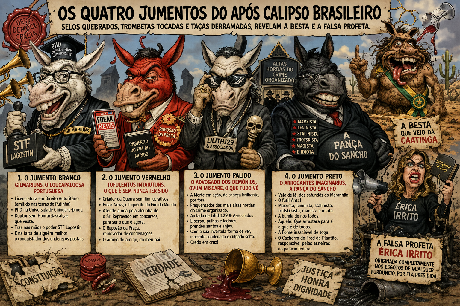 Selos quebrados, trombetas tocadas e taças derramadas, revelam, Os Quatro Jumentos do Após Calipso Brasileiro. Também, a Besta, que veio da Caatinga e a Falsa Profeta Érica Irrito, originada, completamente nos esgotos de qualquer furdúncio, por ela presidida. Jumentos! Por tempo de serviço, são: