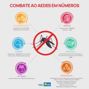 Durante o período sazonal de manifestação da doença, a pasta mobilizou, além dos 542 agentes de Vigilância Ambiental, mais 30 militares do Corpo de Bombeiros e 138 homens do Exército, somados aos servidores dos outros órgãos que colaboraram nas diversas ações de combate ao Aedes aegypti realizadas em todas as regiões administrativas do DF. Foram inspecionados 389.264 imóveis, o fumacê foi aplicado em 453.250 imóveis, com instalação de 653 armadilhas no Gama, Recanto das Emas e Estrutural.