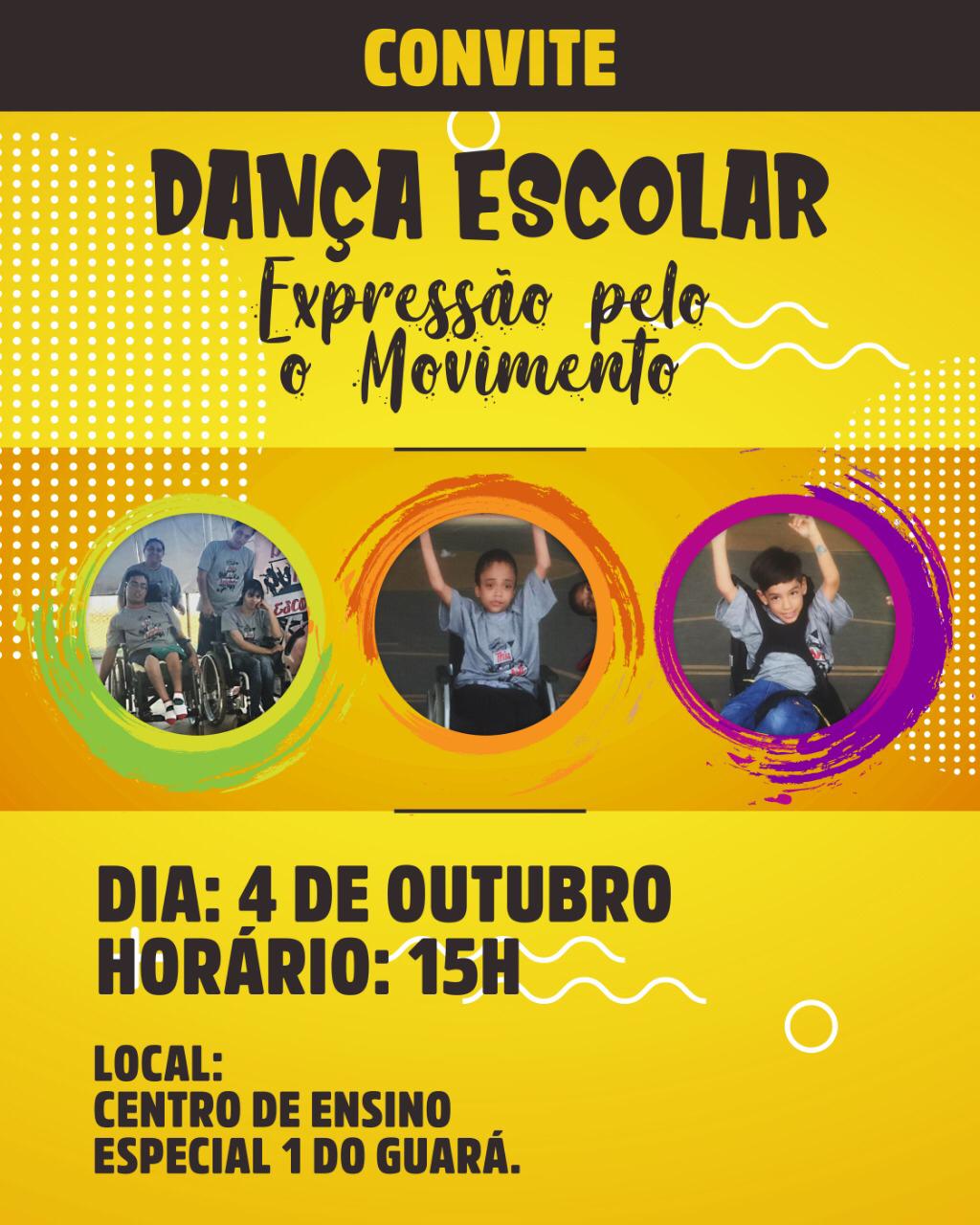 No próximo dia 4 de outubro, sexta-feira, o projeto Dançando nas Escolas encerra a edição deste ano no Centro de Ensino Especial 01 do Guará. O evento ocorre às 15h e é organizado pelo Instituto Avivarte, que é coordenado pela professora Jane Pires.