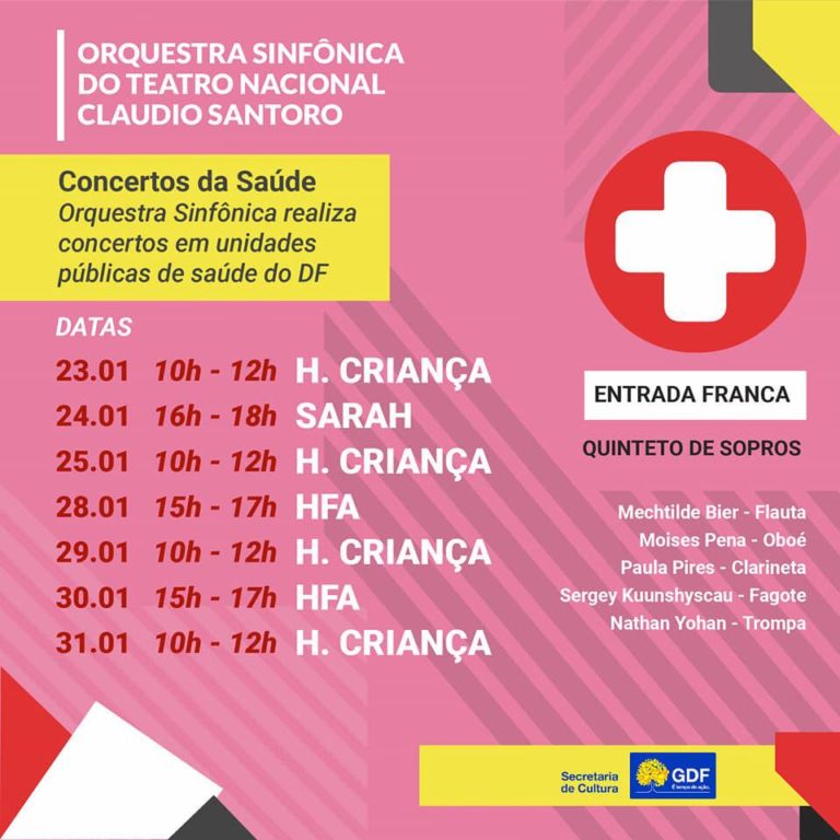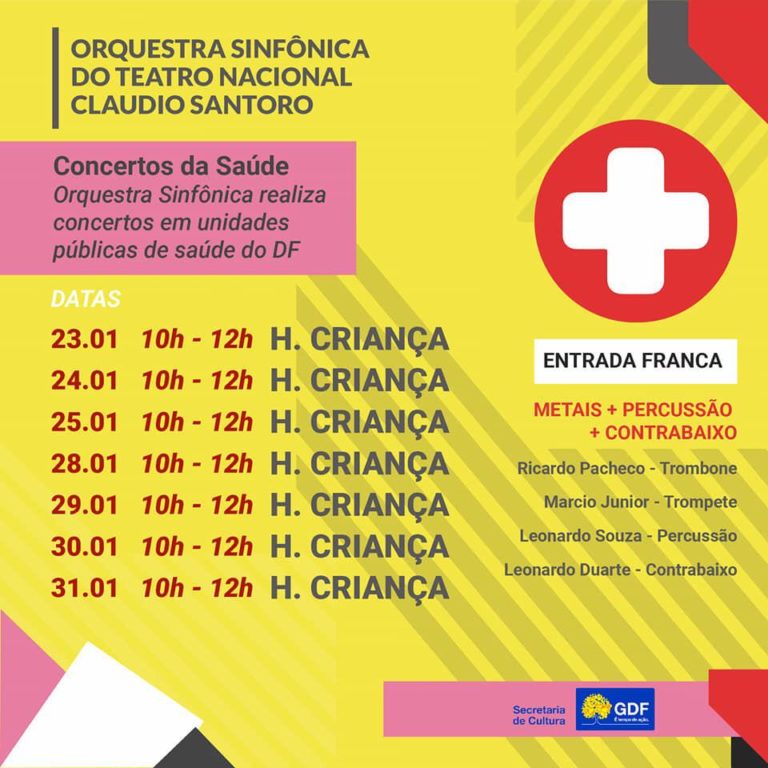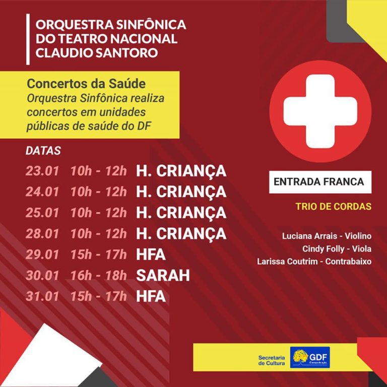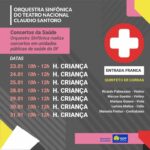 Começou em 23 e vai até 31 de janeiro uma série de apresentações da Orquestra Sinfônica do Teatro Nacional Cláudio Santoro em hospitais públicos de Brasília. O projeto “Concertos da Saúde 2019” é uma iniciativa do Governo do Distrito Federal e faz parte de uma ação de fortalecimento da saúde pública, uma das prioridades do governador Ibaneis Rocha – nesse caso, em busca da humanização do atendimento na rede. Haverá apresentações no Hospital da Criança, no Hospital das Forças Armadas (HFA) e no Sarah Kubitscheck.