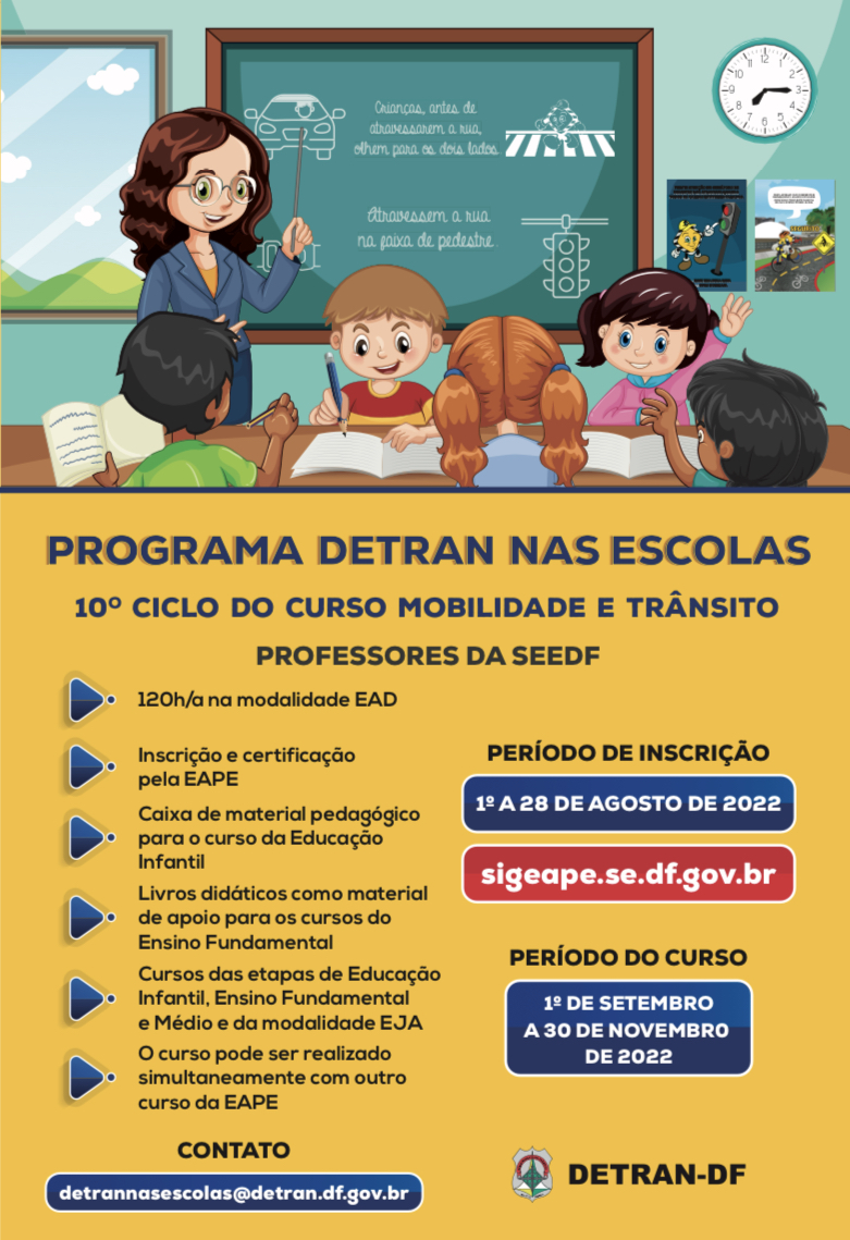 Até o dia 28 de agosto, os professores efetivos e temporários das escolas públicas do Distrito Federal e das instituições de Educação Infantil parceiras podem se inscrever para o curso Mobilidade e Trânsito, oferecido pelo Departamento de Trânsito do Distrito Federal em parceria com a Secretaria de Educação.