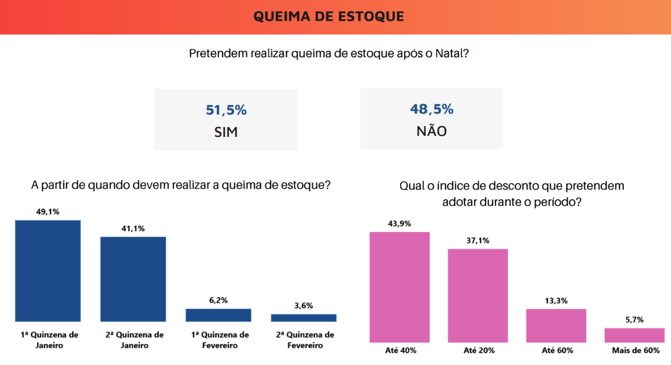 De acordo com a pesquisa, 51,5% dos empresários afirmam que planejam realizar queima de estoque após o Natal, enquanto 48,5% não pretendem adotar essa estratégia. Entre os lojistas que apostam em promoções, a maior concentração ocorre em janeiro: 49,1% devem iniciar as liquidações já na primeira quinzena do mês, enquanto 41,1% planejam os descontos para a segunda quinzena.