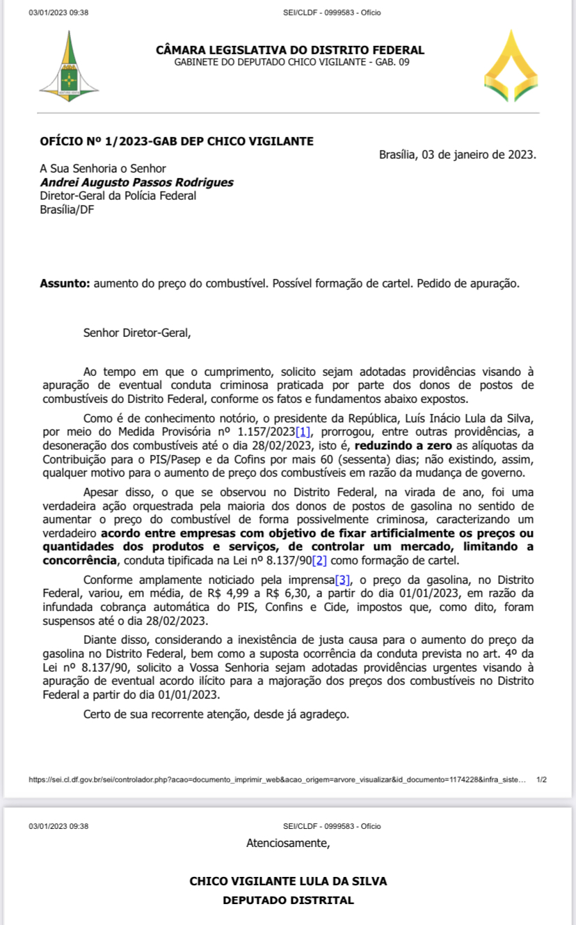 “Solicito a Vossa Senhoria que sejam adotadas providências urgentes visando à apuração de eventual acordo ilícito para a majoração dos preços dos combustíveis no Distrito Federal a partir do dia 01/01/2023”, diz um dos trechos do documento encaminhado à PF e ao Cade pelo distrital.