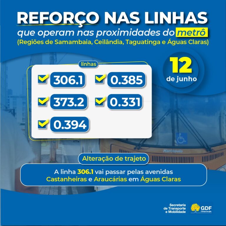 A Secretaria de Transporte e Mobilidade (Semob) autorizou a realização de viagens extras nas linhas de ônibus que atendem as regiões de Samambaia, Ceilândia, Taguatinga e Águas Claras, cidades que estão no percurso das linhas do Metrô-DF, no domingo (12).