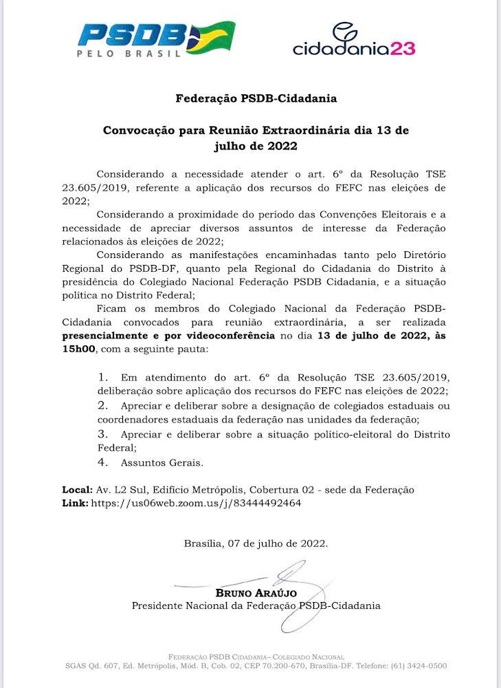 De acordo com o documento assinado pelo presidente nacional da Federação, Bruno Araújo, o encontro, que terá formato híbrido, ainda debaterá outros assuntos como a aplicação dos recursos durante as eleições e a escolha dos nomes para compor o diretório local e definir quem vai coordenar a Federação no DF.