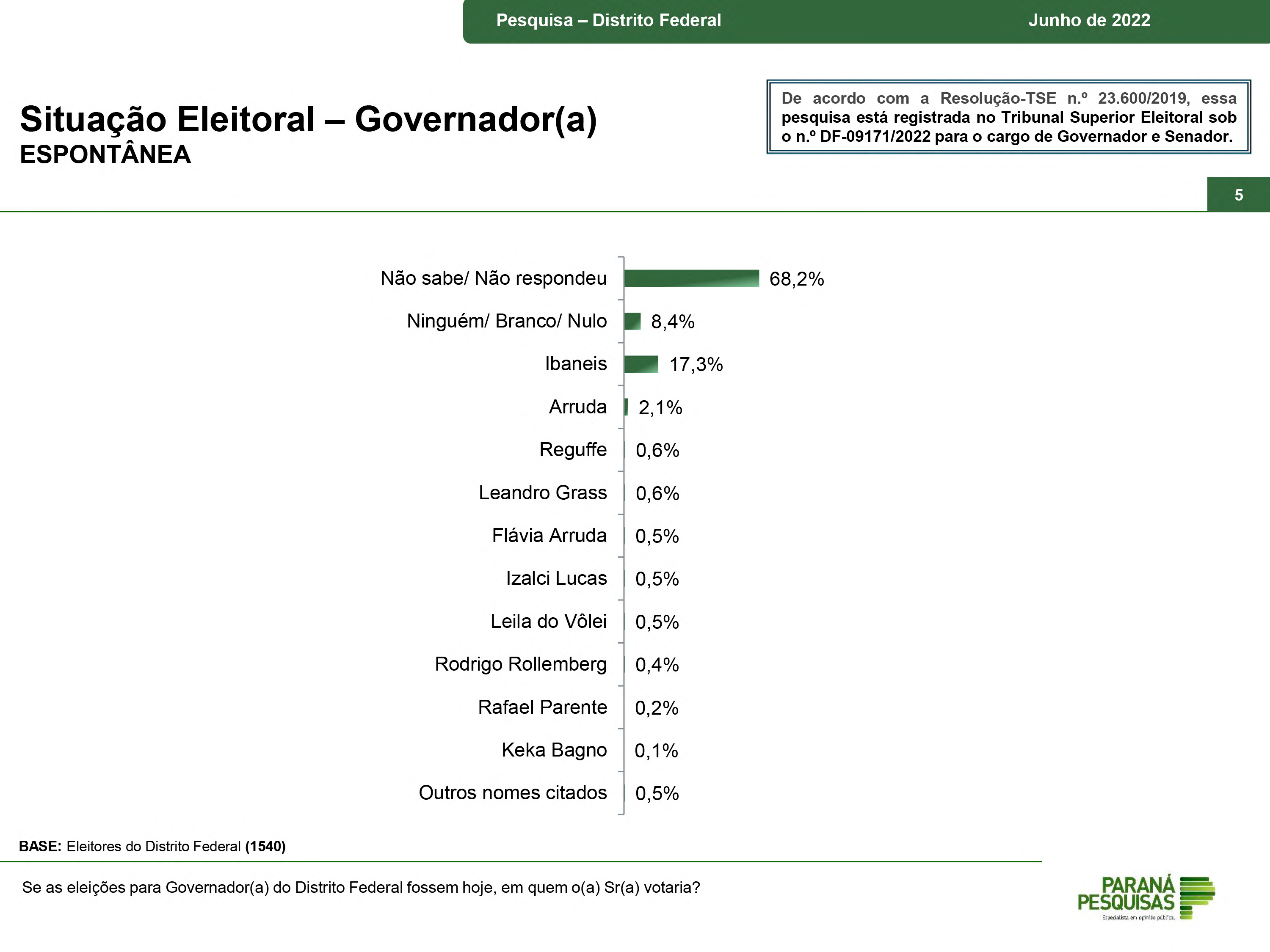 De acordo com o instituto, na pesquisa espontânea ao GDF, a qual o eleitor é provocado a dizer o nome de quem pretende votar para governador, o nome de Ibaneis surge com 17,3%. Em segundo lugar aparece o ex-governador Arruda, do PL, com 2,1%. Reguffe, do União Brasil, e Leandro Grass, do PV, estão com 0,6%. Na sequência, aparecem empatados Flávia Arruda (PL), Izalci (PSDB) e Leila do Vôlei (PDT), todos com 0,5%.