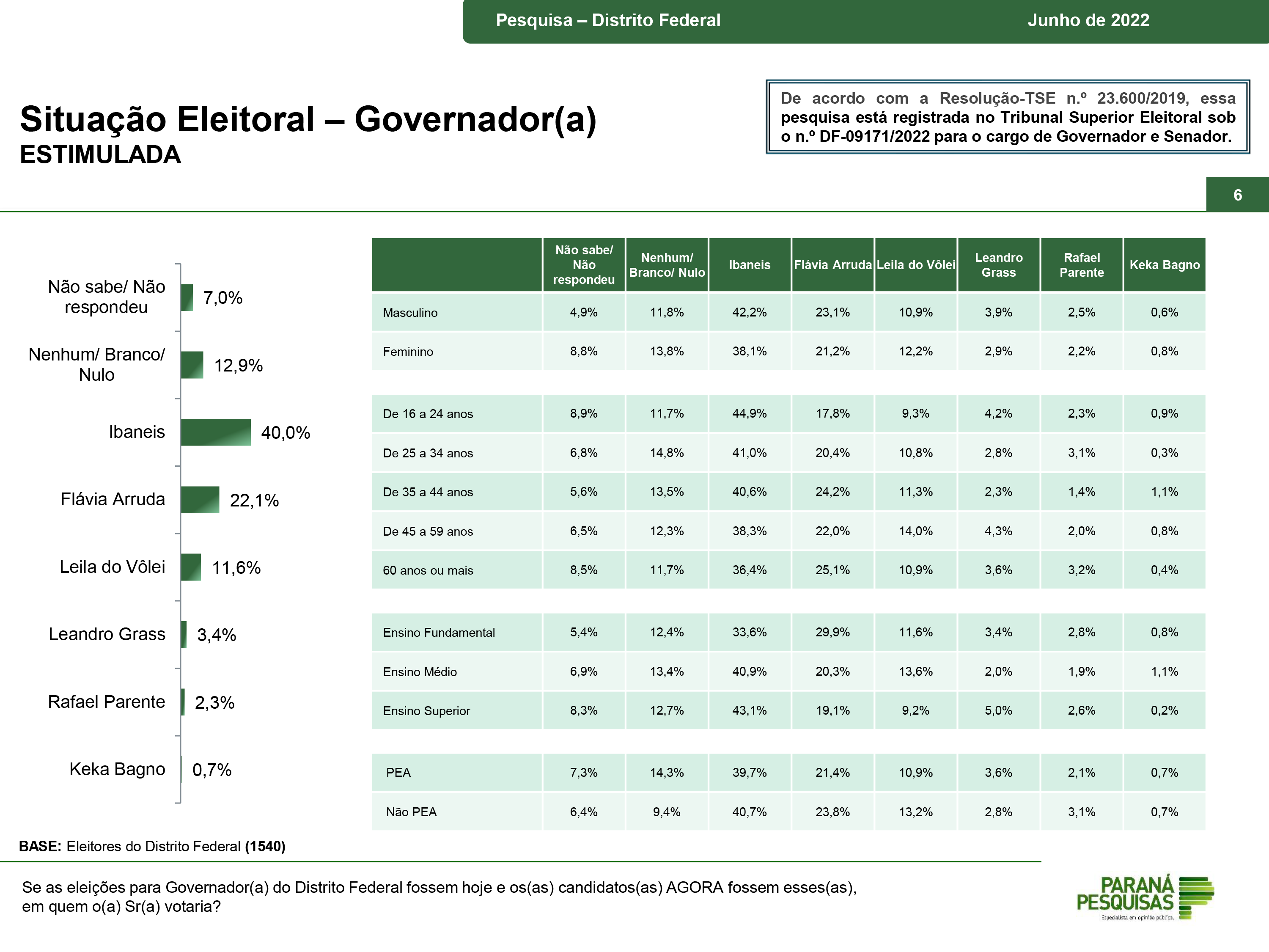 Na pesquisa estimulada, quando o eleitor entrevistado é apresentado a uma lista de nomes de possíveis candidatos, a Paraná Pesquisas simulou dois cenários. No primeiro, o senador Reguffe não está na lista. E no segundo, Reguffe entra e sai a deputada Flávia Arruda.