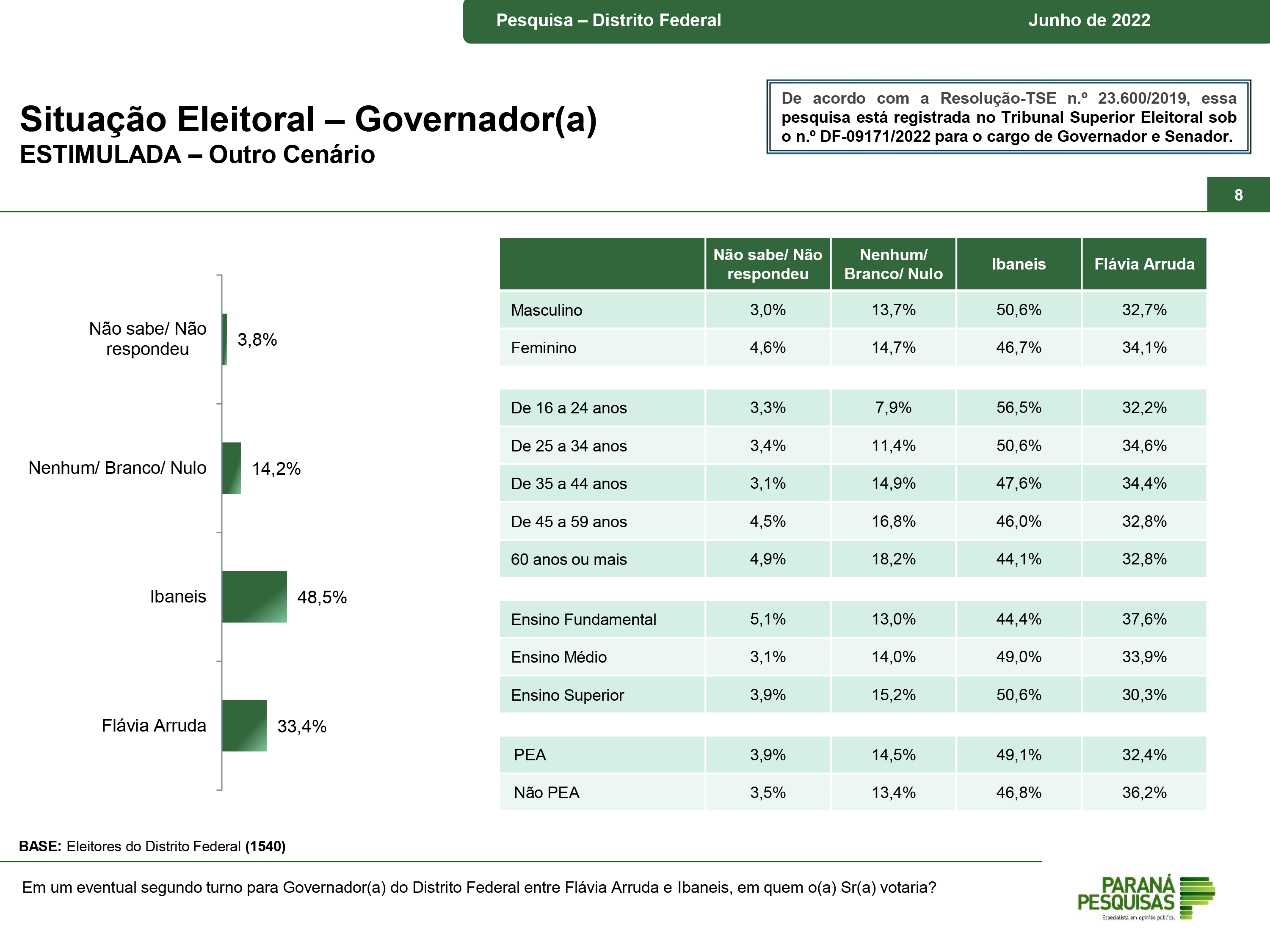 A Paraná Pesquisas também fez dois levantamentos de um eventual 2º turno nas eleições deste ano na corrida para o GDF. No primeiro deles, o instituto perguntou ao eleitor se houvesse confronto entre Ibaneis e Flávia, em quem ele votaria. 48,5% disseram que votariam no atual governador emedebista e 33,4% manifestou que votaria na ex-ministra. Veja abaixo o resultado desse cenário: