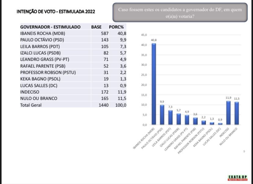 Já quando o eleitor é submetido a uma lista de candidatos, a pesquisa estimulada, Ibaneis Rocha registra 40,8%. Paulo Octávio chega a 9,9%. Leila, 7,3%. Izalci, 5,7%. Leandro, 4,9%. Parente, 3,6%. Professor Robson, do PSTU, 2,2%. Keka, 1,3%. Lucas Salles, do DC, 0,9%. Indecisos, 11,9%. Nulo ou branco, 11,5%.