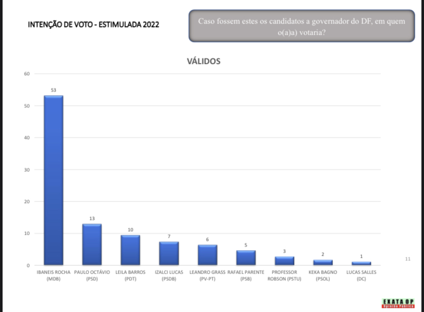 Com base na sondagem estimulada, o Instituto Exata OP apresentou uma projeção dos votos válidos e considerando os números do levantamento o governador Ibaneis Rocha estaria reeleito já no 1º turno com 53% se as eleições fossem hoje.