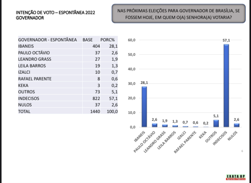 Na pesquisa espontânea, que é quando o eleitor se manifesta livremente em qual candidato pretende votar, Ibaneis Rocha surge com 28,1%. Paulo Octávio, do PSD, aparece em segundo com 2,6%. Leandro Grass, do PV, com 1,9%. Leila do Vôlei, do PDT, 1,3%. Izalci, do PSDB, 0,7%. Parente, do PSB, 0,6%. Keka Bagno, PSol, 0,2%.