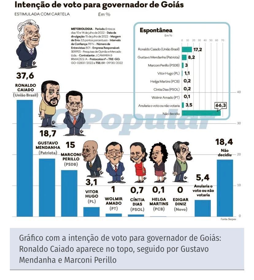 Na primeira pesquisa realizada pelo Serpes em janeiro deste ano, Ronaldo Caiado pontuava com 37,1% e Gustavo Mendanha estava em terceiro com 13%. Ou seja, Caiado não cresceu nada.