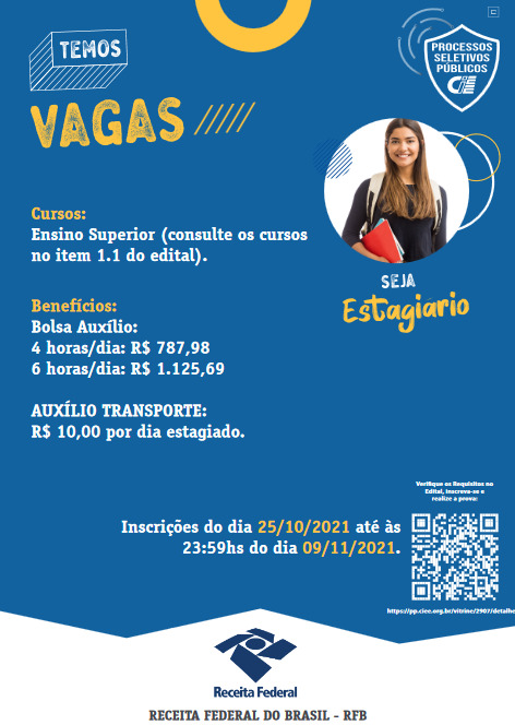 O Centro de Integração Empresa-Escola – CIEE – abre processo seletivo para formação de cadastro reserva para estágio remunerado para a Receita Federal. As vagas são destinadas a estudantes matriculados em instituições de ensino públicas ou privadas, com frequência efetiva em curso de ensino superior, reconhecido pelo Ministério da Educação – MEC.
