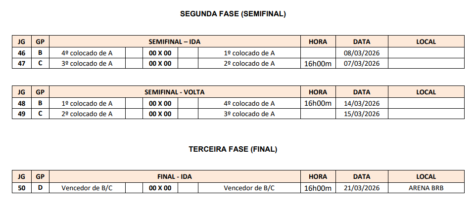 Segundo tabela divulgada pela Federação de Futebol do Distrito Federal, a grande final do Campeonato Candango 2026 está marcada para o dia 21 de março, na Arena BRB Mané Garrincha, em Brasília.