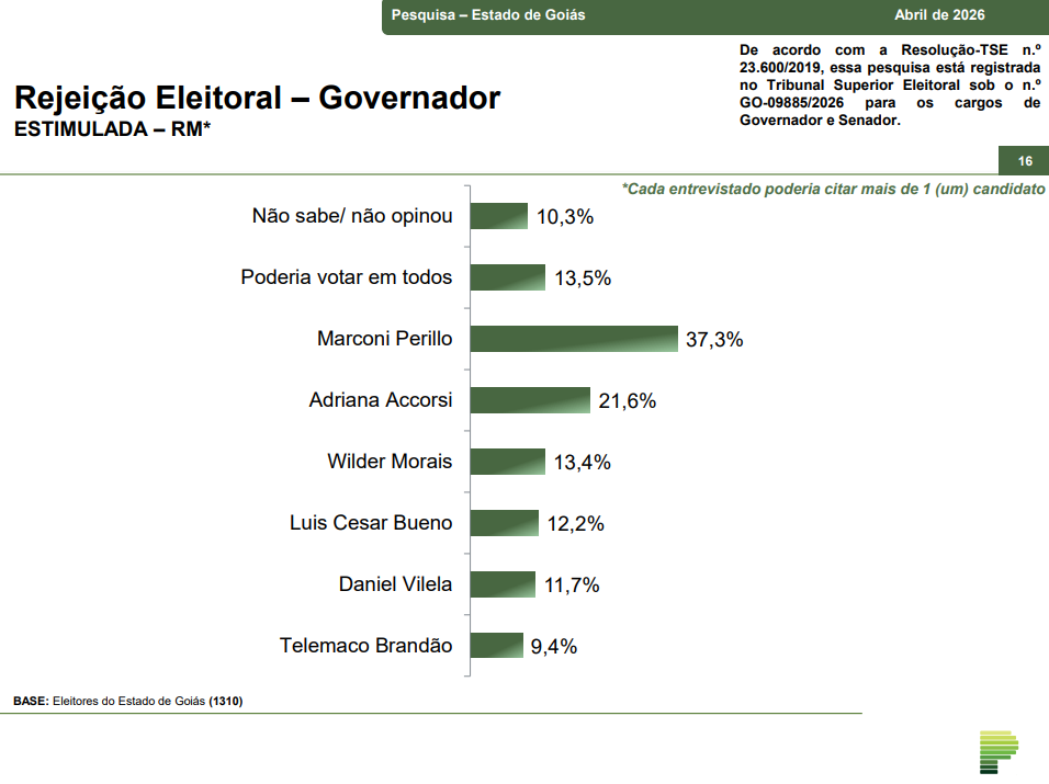 A pesquisa foi realizada entre os dias 1º e 3 de abril, ouviu 1.310 eleitores em 60 municípios de Goiás e possui grau de confiança de 95%. A margem de erro estimada é de 2,8 pontos percentuais, para mais ou para menos.
