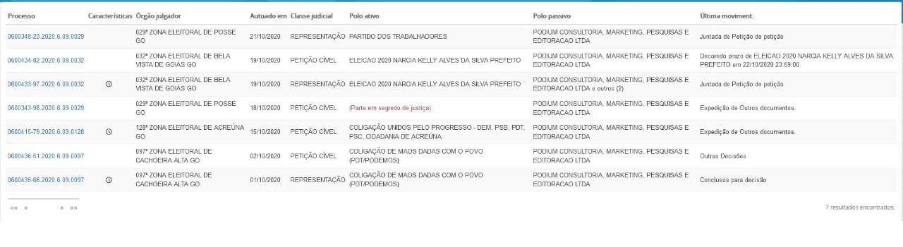 Ao todo, são sete processos sobre esse assunto e fora a coincidência que o instituto só opera em época eleitoral. Além de Valparaíso, o Podium aplicou o mesmo golpe da pesquisa fraudada em outros municípios goianos. São eles: Bela Vista, Posse, Acreúna e Cachoeira Alta.