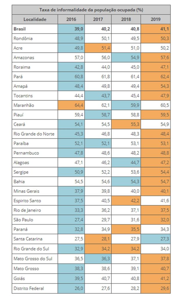 A população ocupada cresceu em 23 unidades da federação. Apesar da queda da taxa de desemprego e da ocupação, 20 estados tiveram taxa recorde de informalidade, isto é, os empregados sem carteiras, os trabalhadores por conta própria sem CNPJ (Cadastro Nacional de Pessoas Jurídicas) e os familiares auxiliares. A maior taxa foi anotada no Pará (62,4%), bem acima da média brasileira (41,1%). Atualmente, há no país 12,6 milhões de desempregados.