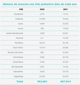 Nos primeiros três dias no ano letivo 2021, a plataforma Google Sala de Aula, usada pela Secretaria de Educação para atender estudantes da rede pública de ensino no DF, registrou 467.614 acessos. O número é 185% maior que os 163.601 registros do ano passado, quando a ferramenta começou a ser usada.