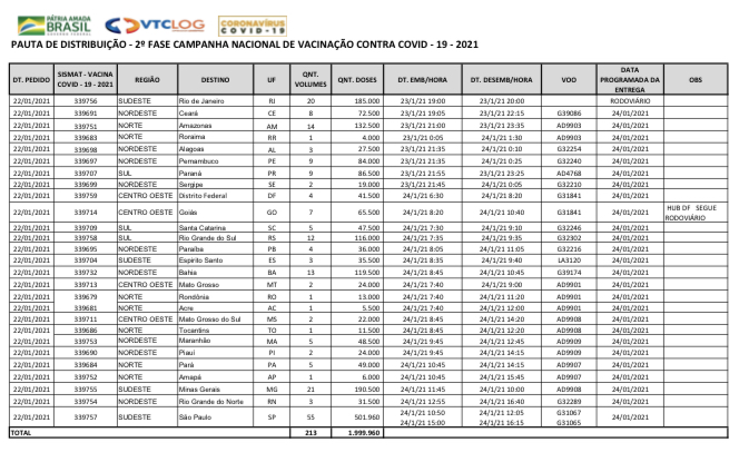 Ainda neste sábado, um carregamento com 132,5 mil doses seguirá para o Amazonas e outras 72,5 mil doses seguirão para o Ceará. Pelo cronograma, os demais estados e o Distrito Federal devem receber as doses da vacina a partir de amanhã (24).