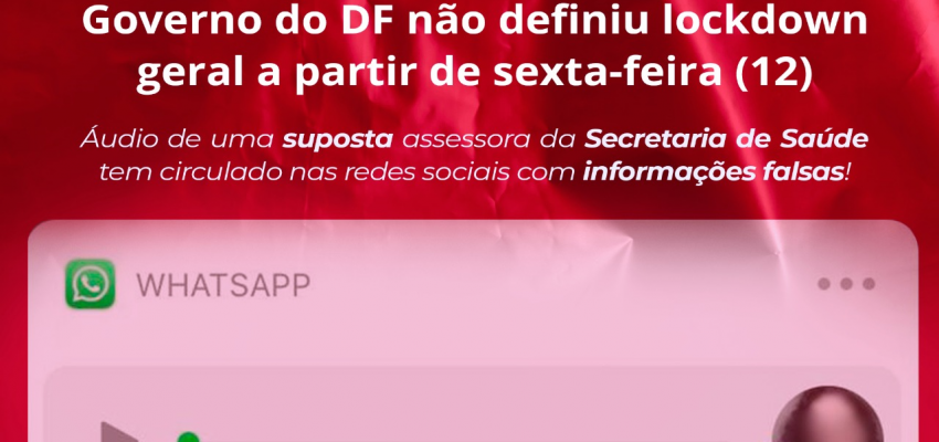 A Secretaria de Saúde do DF (SES/DF) divulgou no fim da tarde desta quinta (11) um alerta para a população sobre informações falsas que têm sido disseminadas nas redes sociais. Um áudio, atribuído a uma mulher chamada Larissa, que supostamente seria assessora da Secretaria de Saúde, tem circulado em grupos de WhatsApp alertando para um … Continue lendo É FAKE! | GDF divulga que não definiu lockdown total a partir de sexta (12)