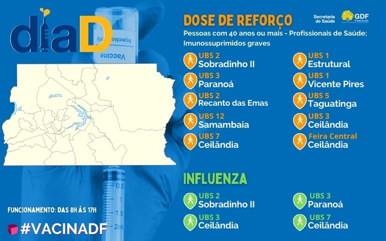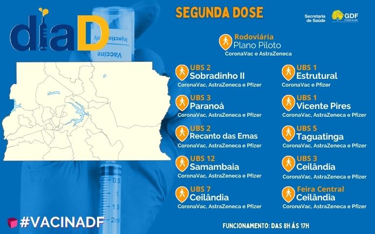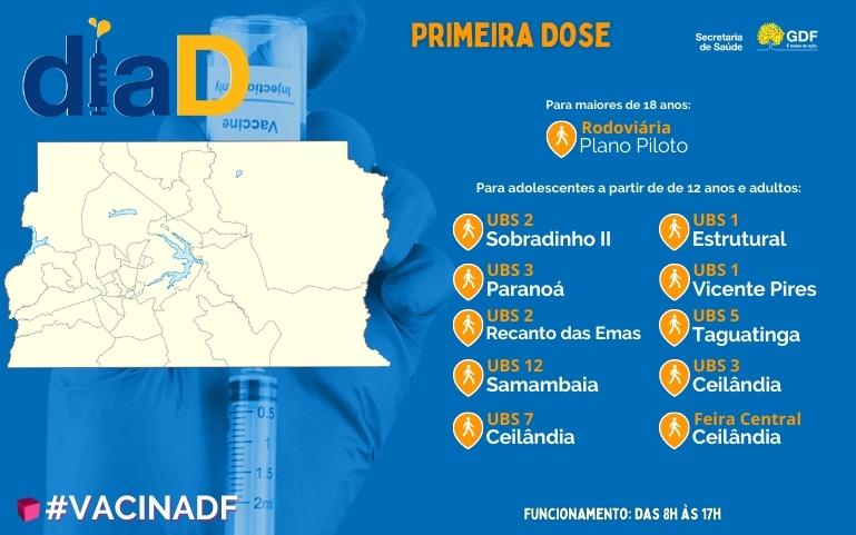 De acordo com a Secretaria de Saúde, serão disponibilizados onze pontos de vacinação, sendo nove em unidades básicas de saúde e dois pontos populares: um na Rodoviária do Plano Piloto e outro na Feira Central de Ceilândia.