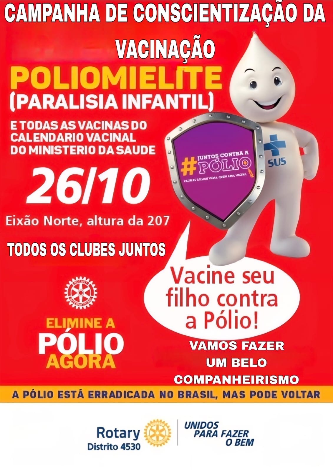 O combate à poliomielite segue como uma das principais bandeiras do Rotary International em todo o mundo. Neste domingo (26), os clubes do Rotary da capital federal, que integram o Distrito 4530, participam da campanha de vacinação contra a pólio no Eixão do Lazer, na altura da 207 Norte.