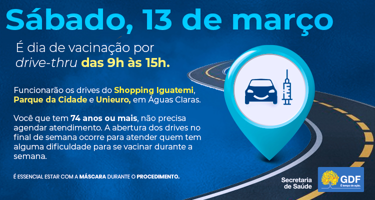 A campanha de vacinação contra a Covid-19 no Distrito Federal continua neste sábado (13), das 9h às 15h, em três pontos de drive-thru, localizados no Parque da Cidade, no estacionamento 13, na faculdade Unieuro e no Shopping Iguatemi. Neste momento estão sendo vacinadas pessoas com 74 anos ou mais. Este é o segundo sábado consecutivo … Continue lendo VACINAÇÃO CONTRA COVID | Três postos drive-thru funcionam neste sábado (13) no DF