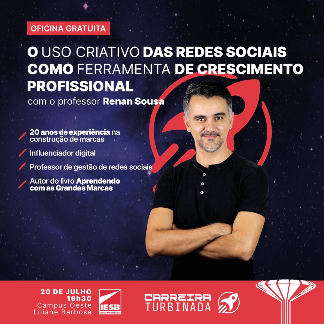 Quer aprender a utilizar as redes sociais para turbinar os negócios e a sua carreira? Então anote esta dica: no dia 20/7, às 19h30, o Centro Universitário IESB promove a oficina “O uso criativo das redes sociais como ferramenta de crescimento profissional”. O bate-papo será ministrado pelo professor Renan Sousa, docente do curso de Gestão em Redes Sociais da instituição, e realizado de forma presencial, no auditório 1 do IESB campus Liliane Barbosa, em Ceilândia. O encontro é gratuito e aberto ao público.