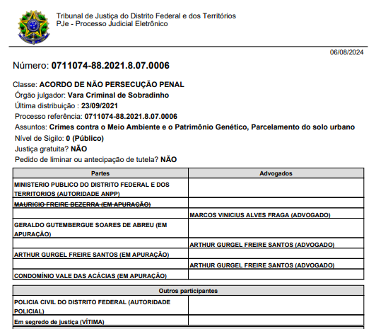 De acordo com o processo 0711074-88.2021.8.07.0006, o CANDIDATO AO CONSELHO DA CHAPA 10 foi acusado de grilagem de terra no condomínio Vale das Acácias, que fica em Sobradinho II.