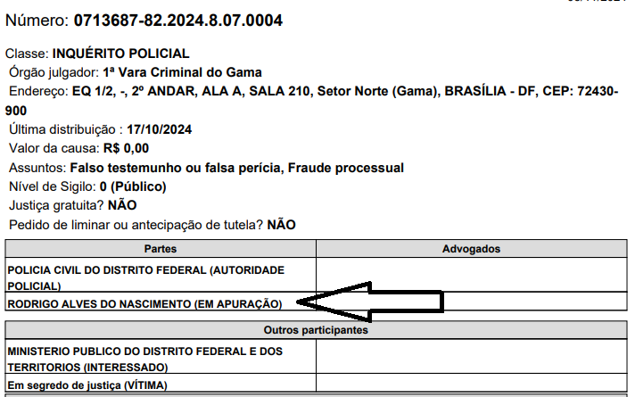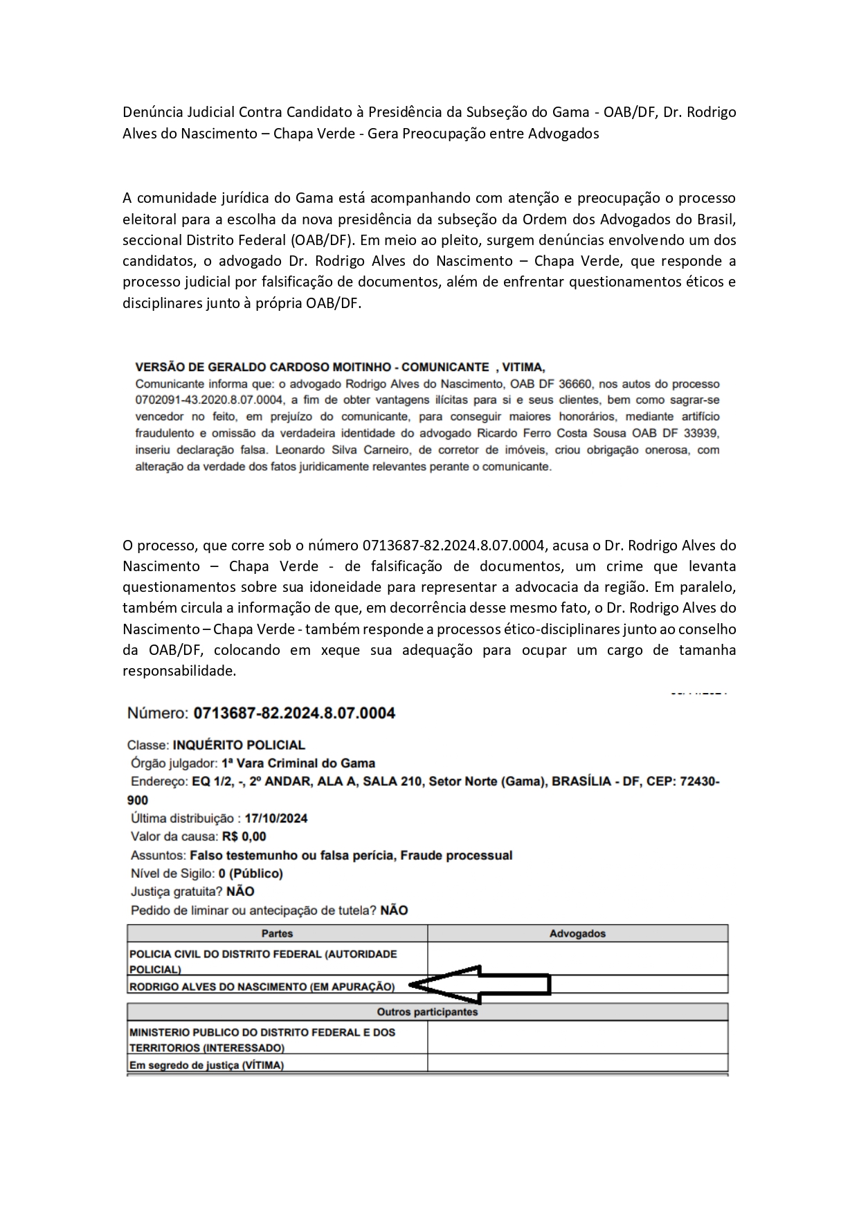 Faltando 11 dias para que os advogados da Seccional do Distrito Federal da Ordem dos Advogados do Brasil (OAB/DF) escolham quem vai presidir a instituição e também as Subseções em funcionamento no triênio 2025/207, um grupo de profissionais do gama denuncia o candidato da chapa 10 da Subseção do Gama, Rodrigo Alves do Nascimento, que é suspeito de falsificar documentos e fraude processual conforme consta no processo nº 0713687-82.2024.8.07.0004 (vide abaixo).