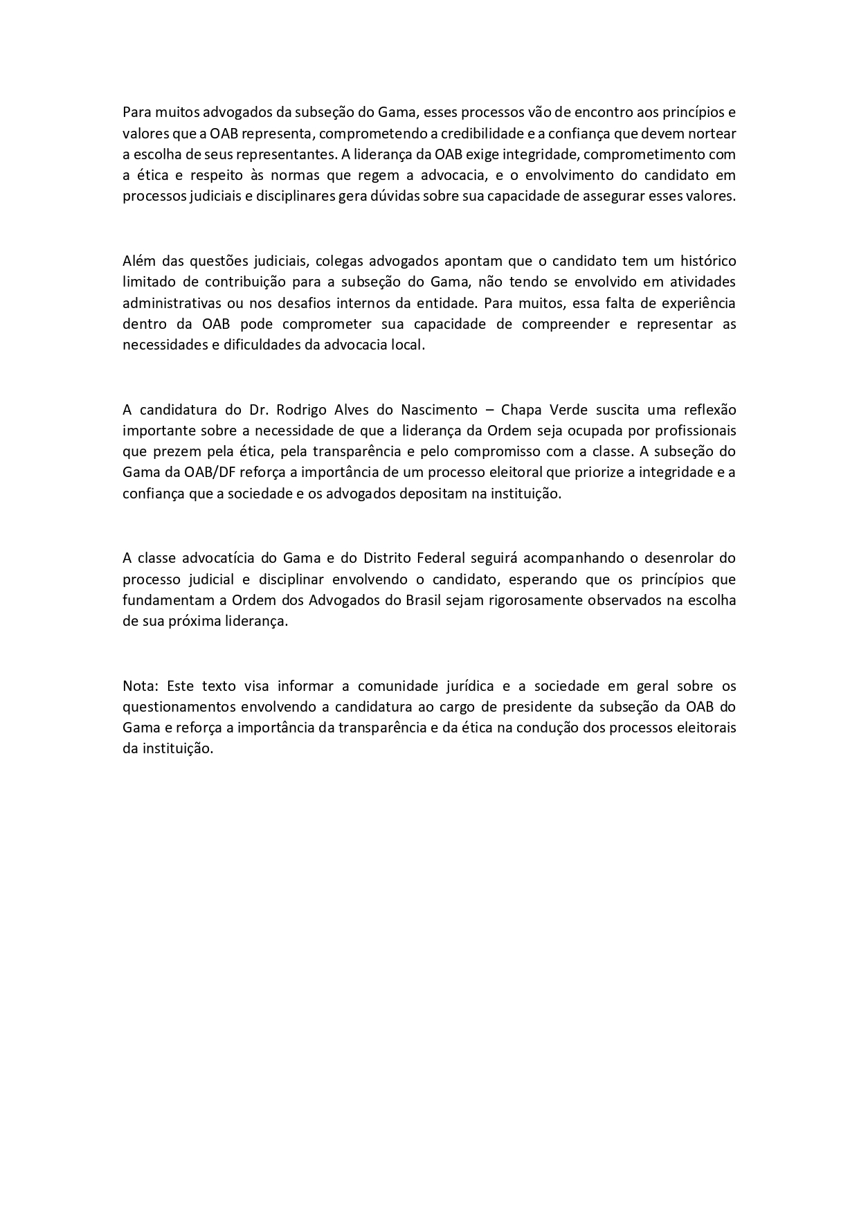 Apesar do documento não constar os nomes desses profissionais do Gama que questionam o comportamento do candidato da chapa 10 para a Subseção da região, os advogados ressaltam que “a liderança da OAB exige integridade, comprometimento com a ética e respeito às normas que regem a advocacia, e o envolvimento do candidato em processos judiciais e disciplinares gera dúvidas sobre sua capacidade de assegurar esses valores”.