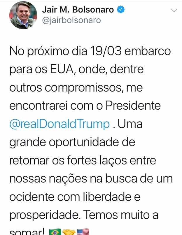 Em sua conta pessoal no Twitter, Bolsonaro anunciou que embarcará para os EUA no dia 19 de março e demonstrou que está animado com o encontro que terá com o presidente norte-americano, Donald Trump. “[Será] Uma grande oportunidade de retomar os fortes laços entre nossas nações na busca de um ocidente com liberdade e prosperidade. Temos muito a somar!”.