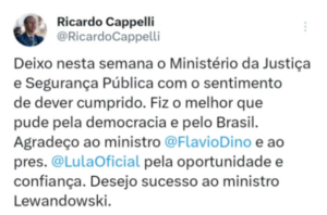O antigo chefe, o ainda senador e futuro ministro do STF, Flávio Dino, bem que tentou passar o bastão ou até mesmo mantê-lo no cargo, mas, Ricardo Cappelli, secretário-executivo do Ministério da Justiça e Segurança Pública, foi preterido por Ricardo Lewandowski, que assumiu o comando do órgão recentemente. Ciente de que não ficará na função, Cappelli resolveu se manifestar nas redes sociais, nesta segunda-feira (29), sobre sua saída da pasta.