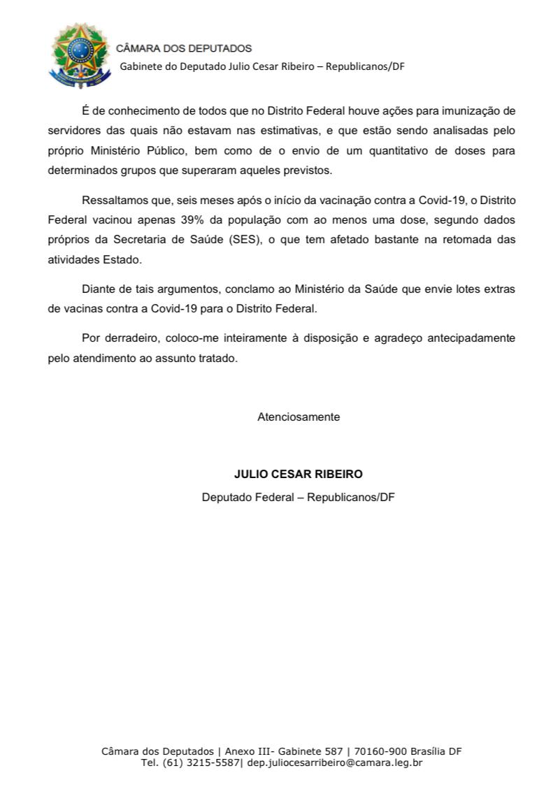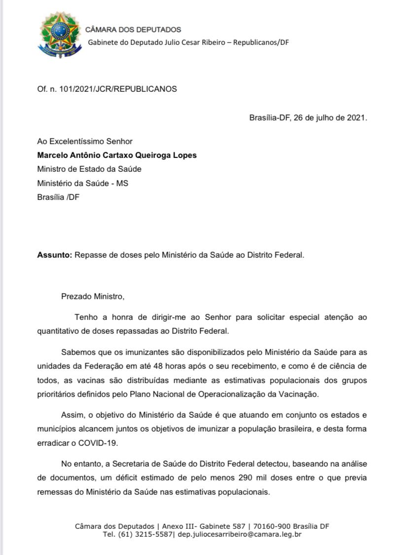 No documento encaminhado ao ministro (veja acima), Julio Cesar ressalta que o DF encontra-se com apenas 39% de sua população vacinada com a 1ª dose (D1). O Ministério da Saúde divulgou que quase 60% da população brasileira já recebeu a D1.