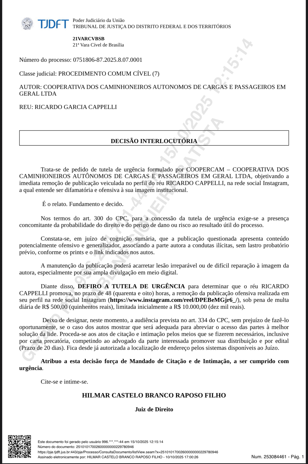 O juiz Hilmar Castelo Branco Raposo Filho, da 21ª Vara Cível de Brasília, determinou a remoção de um vídeo em que o esquerdista faz acusações infundadas contra a vice-governadora e a Coopercam, alegando que Ricardo Cappelli não apresentou as provas.