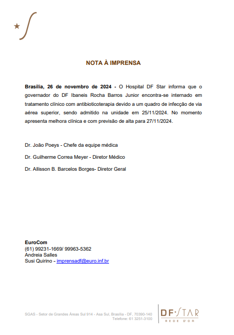 Confira abaixo a nota à imprensa divulgada pelo hospital onde Ibaneis Rocha encontra-se internado.
