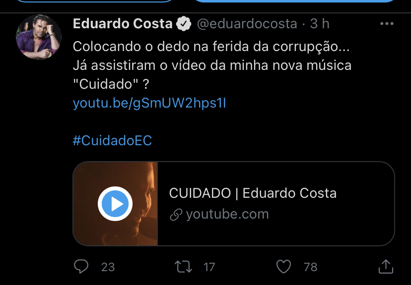 Em seu perfil no Twitter, Eduardo Costa divulgou o link do clipe afirmando que estava “colocando o dedo na ferida da corrupção”.