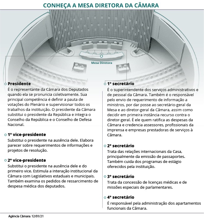 A Mesa é responsável pela direção dos trabalhos legislativos e dos serviços administrativos da Casa. Entre suas atribuições, também está a promulgação de emendas à Constituição, juntamente com o Senado.
