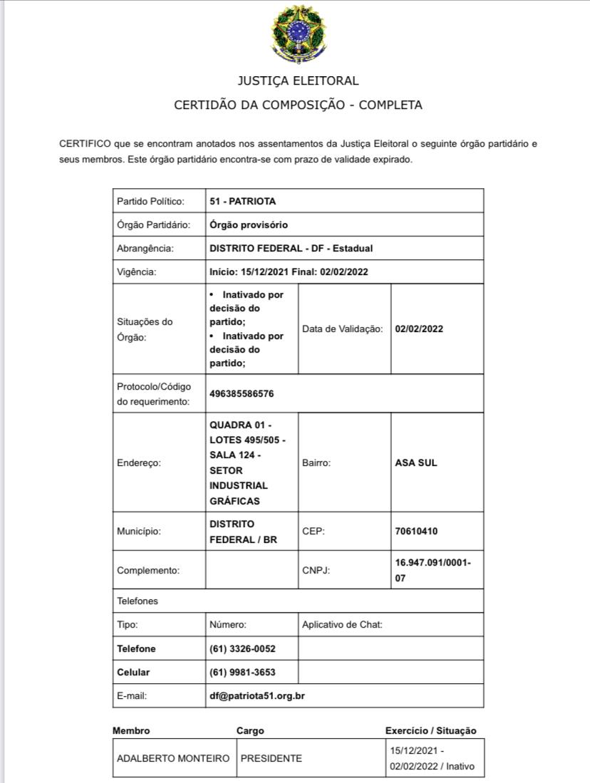 A informação da saída de Adalberto já consta na Justiça Eleitoral e pode ser confirmada por meio da certidão de composição partidária do Patriota-DF.