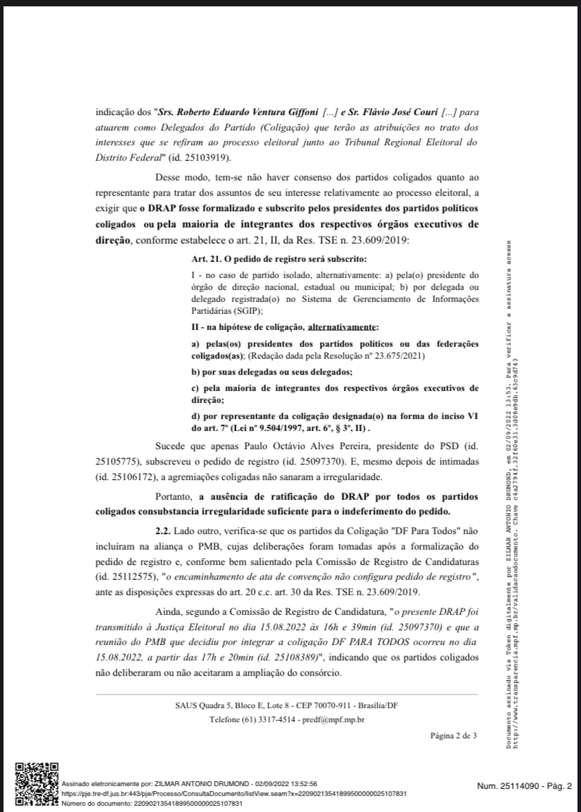 No parecer, o procurador pede o indeferimento do DRAP da coligação de PO porque está caracterizada a “ausência de deliberação quanto à nomeação de representante ou delegado da Coligação “DF Para Todos” para a formalização do pedido (de registro de candidatura)”.