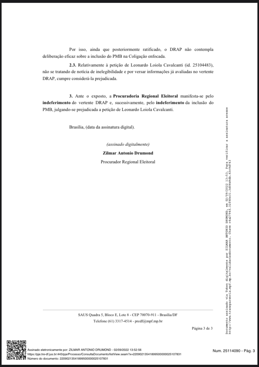Veja abaixo o parecer do MP Eleitoral do DF: