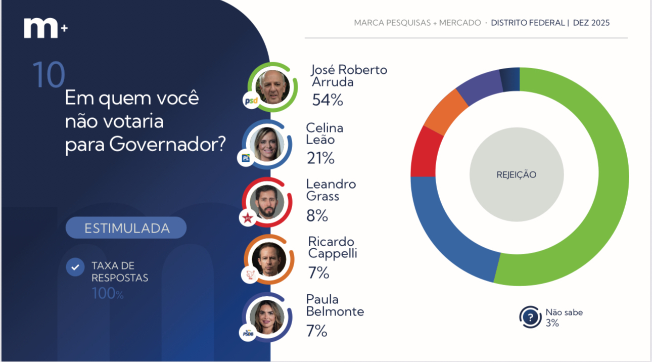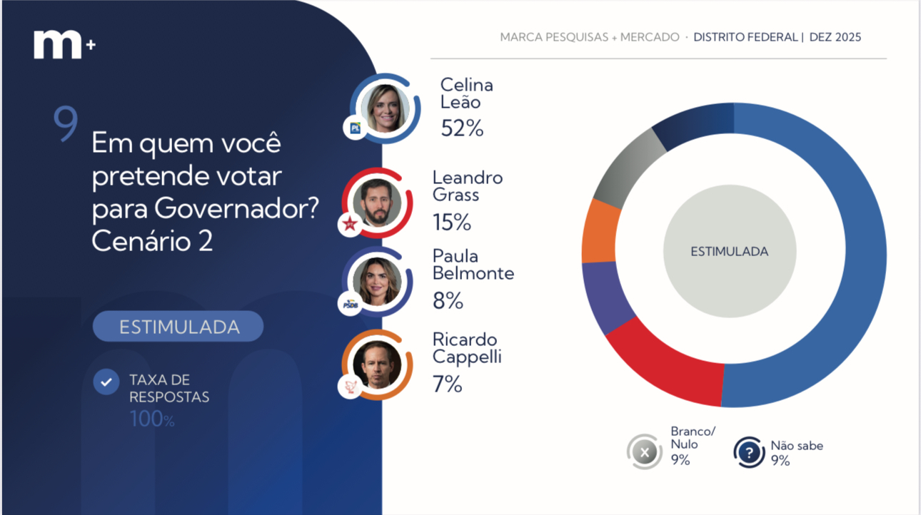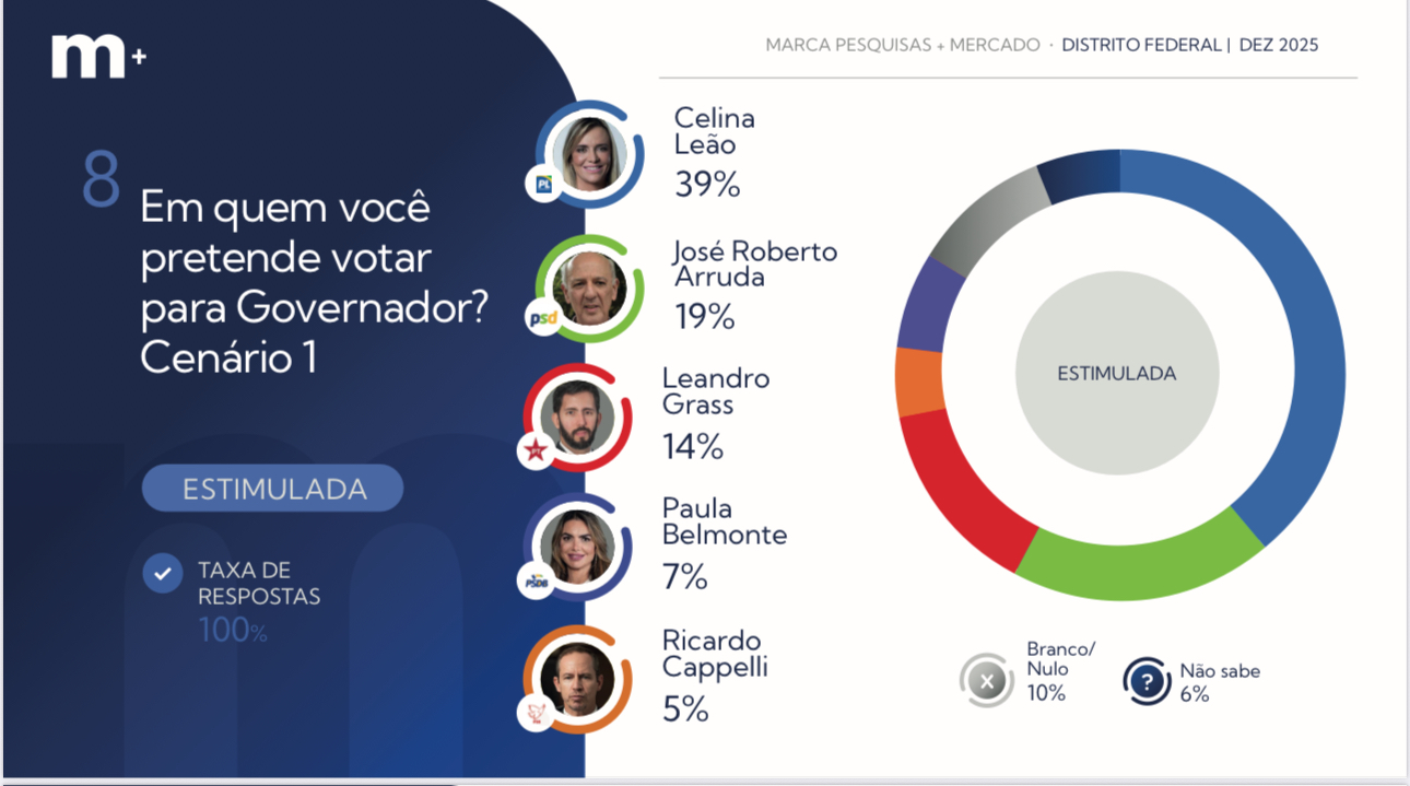 O levantamento divulgado nesta terça-feira (23) pelo Instituto Marca Pesquisa mostra Celina Leão com 39% das intenções de voto, abrindo uma vantagem de 20 pontos percentuais sobre Arruda, que aparece com 19%. Na sequência, surgem Leandro Grass (14%), Paula Belmonte (7%) e Ricardo Cappelli (5%).