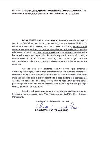 Essa é a primeira vez na história da OAB/DF que um presidente pede licença do cargo para concorrer à reeleição. Délio Lins e Silva, inclusive, cita no comunicado entregue que essa não era uma medida necessária.