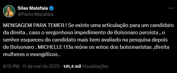 O líder evangélico, bastante influente entre os bolsonaristas, direcionou sua publicação a Temer, afirmando que o ex-presidente “esqueceu do candidato mais bem avaliado na pesquisa depois de Bolsonaro: Michelle”.