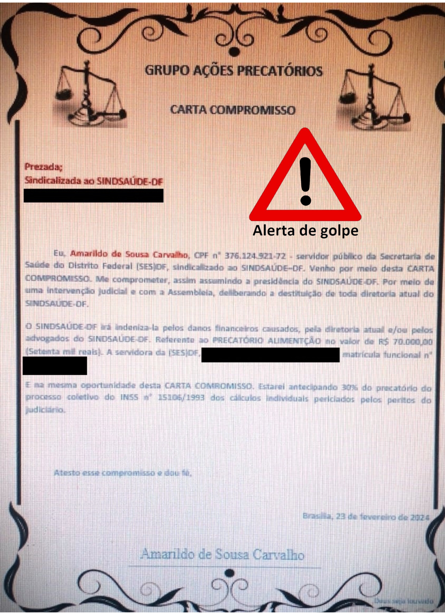 Na última segunda (26), o Ministério Público do Distrito Federal e Territórios (MPDFT) recebeu denúncias apresentadas por servidores da rede pública de saúde do DF que alegam que caíram no golpe de uma ‘carta-compromisso’ assinada pelo servidor Amarildo de Sousa Carvalho se comprometendo a indenizar o valor de R$ 70 mil para quem adquiriu o documento. Amarildo é apontado como o coordenador de um grupo de servidores que se autointitula ‘Grupo Ações Precatórios’.