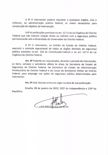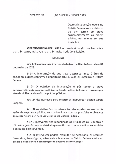 Ainda de acordo com o decreto assinado por Lula, a intervenção federal será apenas nas forças de segurança da capital federal e o interventor estará subordinado diretamente a ele. O documento especifica que Ricardo Capelli não estará sujeito às normas distritais que conflitarem com as medidas necessárias para o restabelecimento da ordem e a intervenção tem duração até o dia 31 de janeiro deste ano.